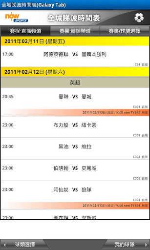 各大足球聯賽盃賽、NBA 賽果賽程及播放頻道,一目了然