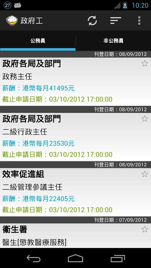 「政府工」提供香港特別行政區公務員事務局網頁所提供的招聘資訊,包括刊登於公務員事務局網頁中的公務員及非公務員職位空缺。